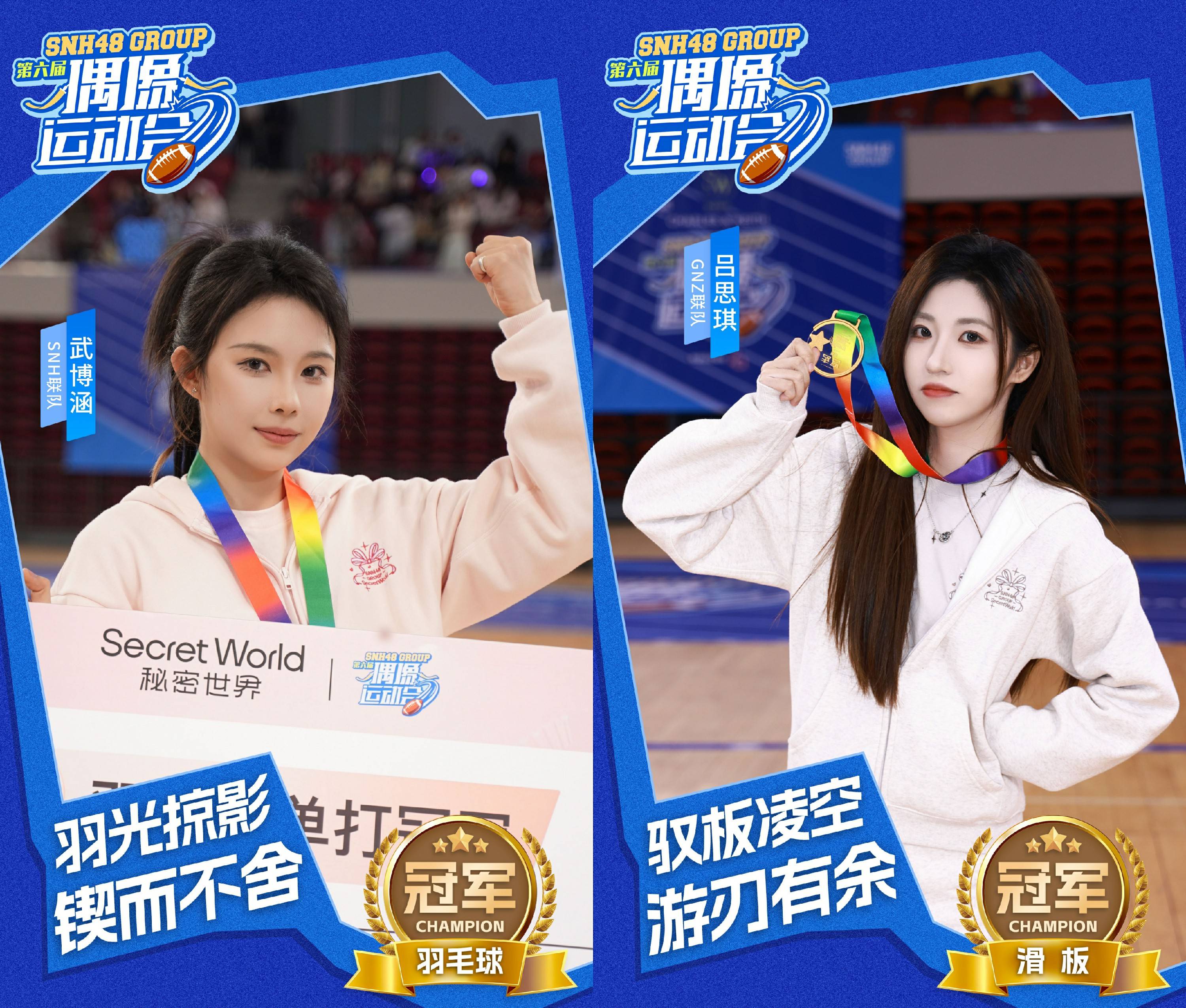 首先进行的羽毛球单打项目之中,不仅有宋昕冉、刘增艳等参加过多次羽毛球单打项目的强将,也有初生牛犊不怕虎的新生代力量加入战局,让最终的赛果扑朔迷离。最终由SNH48武博涵拿下羽毛球单打冠军,GNZ48徐楚雯、SNH48刘增艳则分获亚军与季军。作为今年全新设置的运动项目,滑板兼有强竞技性与强观赏性的双重属性,因而成为了参赛成员们想要挑战的重点项目。选手们需要驾驭滑板,穿过所设置的障碍,最终拥有丰富运动经验的GNZ48吕思琪一马当先,成功将冠军奖牌收入囊中。