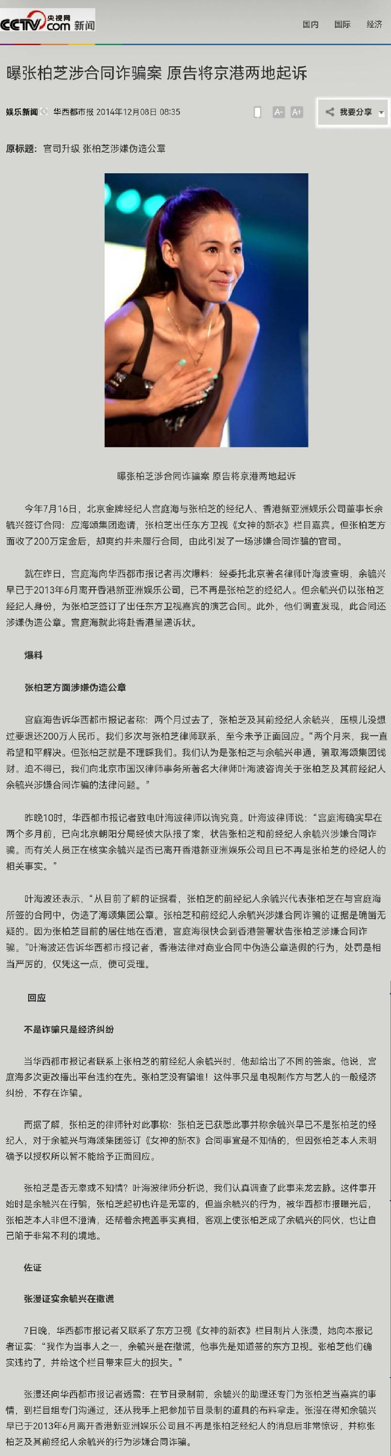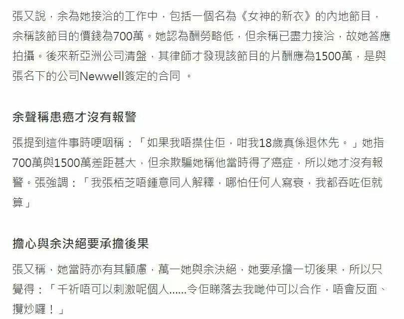 余毓兴曾与北京金牌经纪人宫庭海签订张柏芝出任东方卫视《女神的新衣》栏目嘉宾的合同,并单方面收取200万定金,最后却爽约并未履行合同。后经宫庭海委托律师叶海波查明:余毓兴早已于2013年6月离开香港新亚洲娱乐公司,已不再是张柏芝的经纪人。但余毓兴仍以张柏芝经纪人身份,为张柏芝签订了出任东方卫视嘉宾的演艺合同。