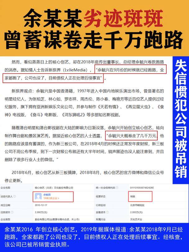 前经纪人余毓兴被指长期伪造合约、私吞酬劳、虚构项目,更在其公司早已清盘的情况下,以虚假合同与公章继续“招摇撞骗”。