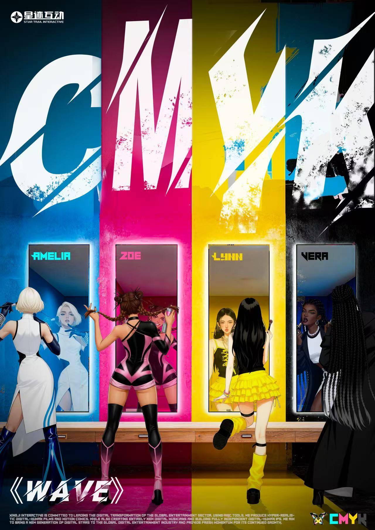 2025年12月10日,星迹互动(Star Trail Interactive)旗下正式推出全球首支以职业女性为特色的虚拟偶像女团CMYK(中文名称:星迹女孩),并同步发布出道单曲《WAVE》。这支由来自四大洲、拥有不同职业背景的虚拟成员组成的团体,旨在通过音乐与科技的结合,展现当代女性的多元魅力。