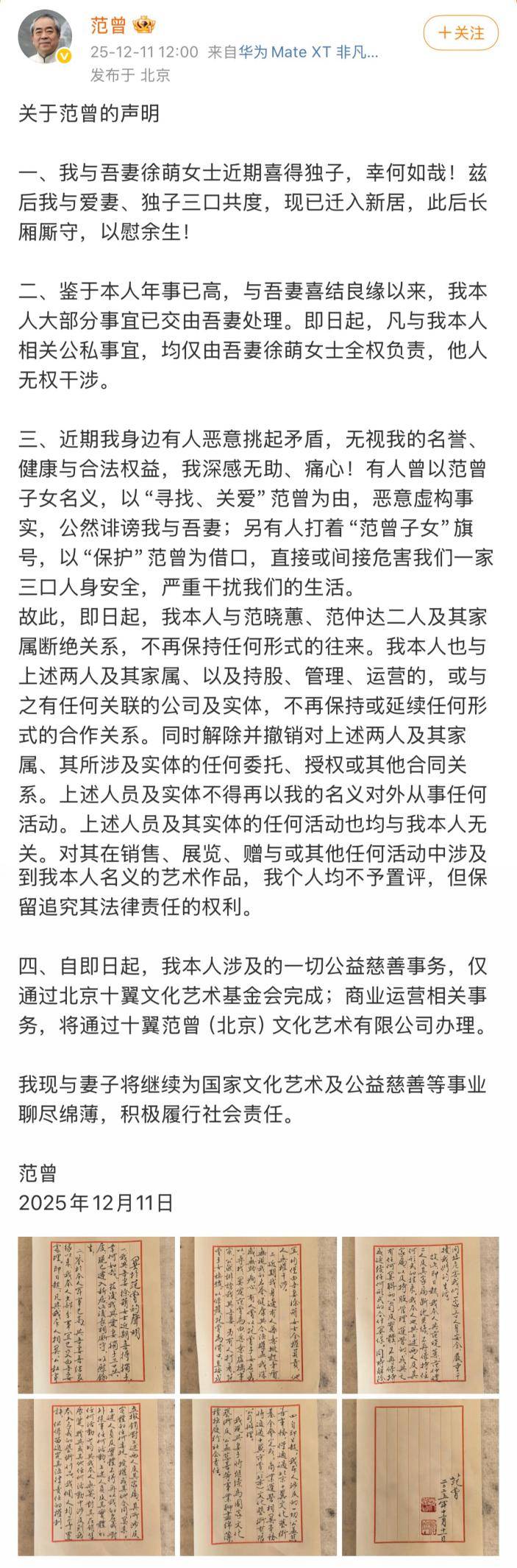 同日范曾先生也开通了个人社交媒体账号,通过亲笔手写信向外界分享了一则家庭喜讯:夫妻近期喜得一子,且未来范曾先生的各类事务将全部交由夫人徐萌女士负责处理。或许因为近期夫妻全心投入家庭,专注于新生命的到来,未能第一时间与外界分享喜悦,使得网络上出现了不实消息,因此范曾先生明确表示,任何冒充其子女身份的言论和行为皆为造谣和欺诈,望大众警惕。